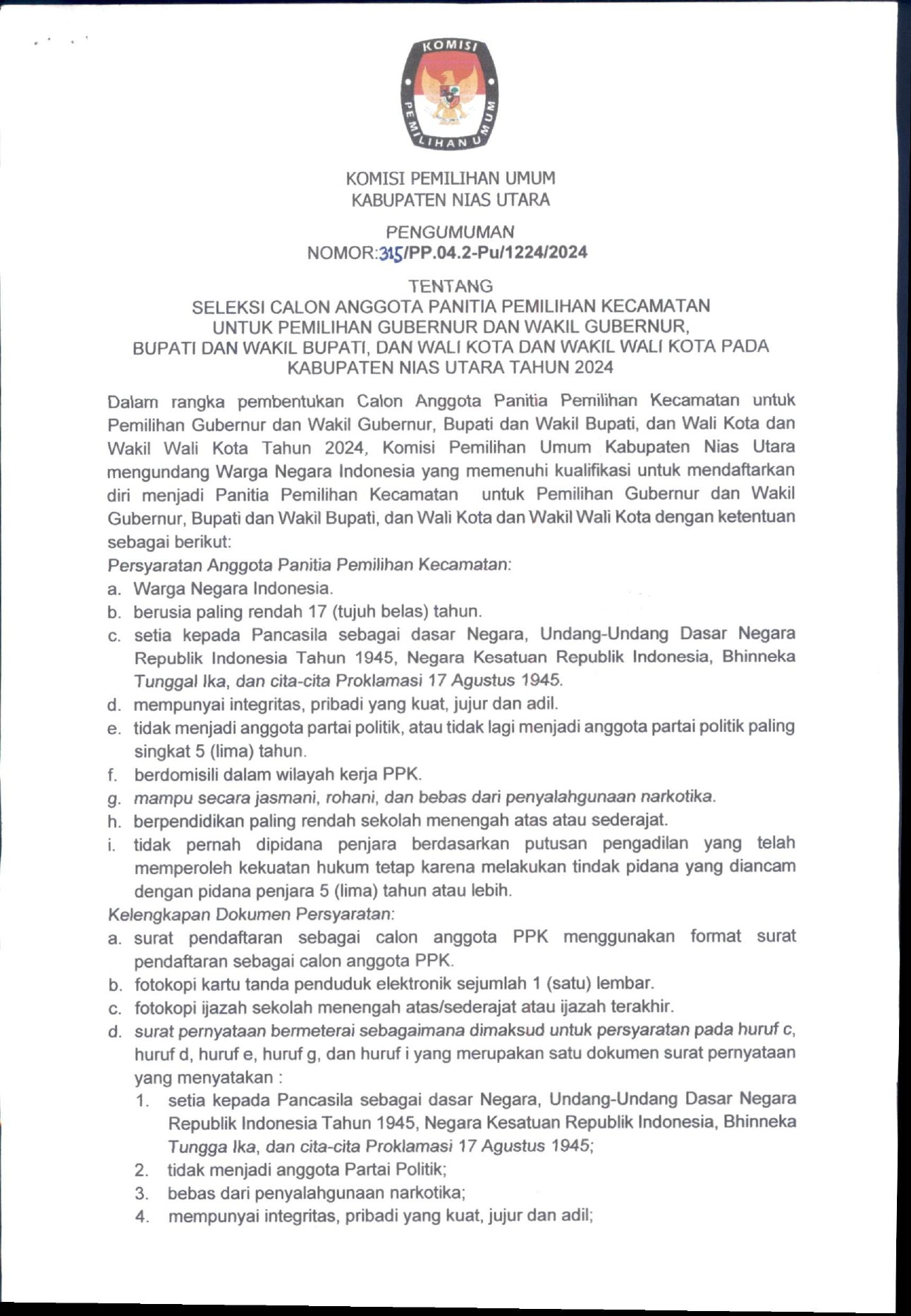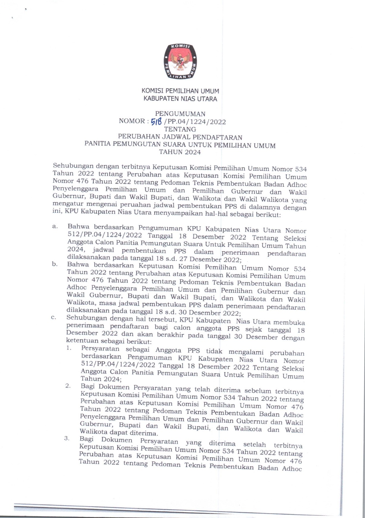 KPU Kabupaten Nias Utara menyampaikan Pengumuman Perubahan Jadwal Pendaftaran Panitia Pemungutan Suara untuk Pemilu Tahun 2024