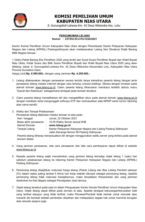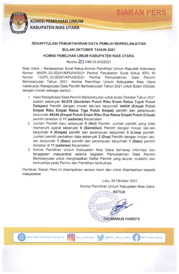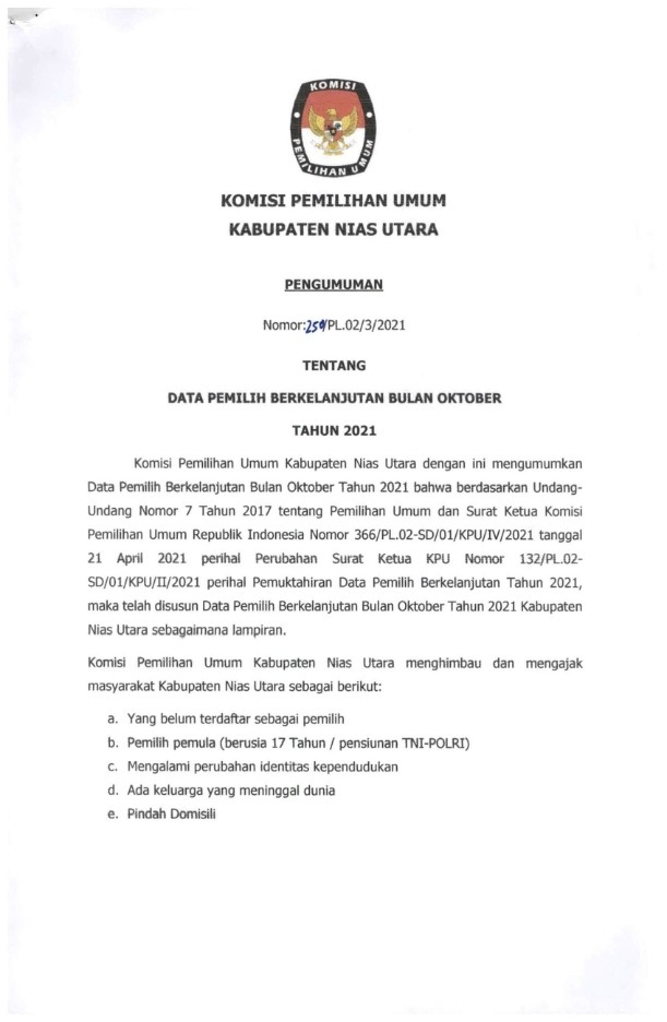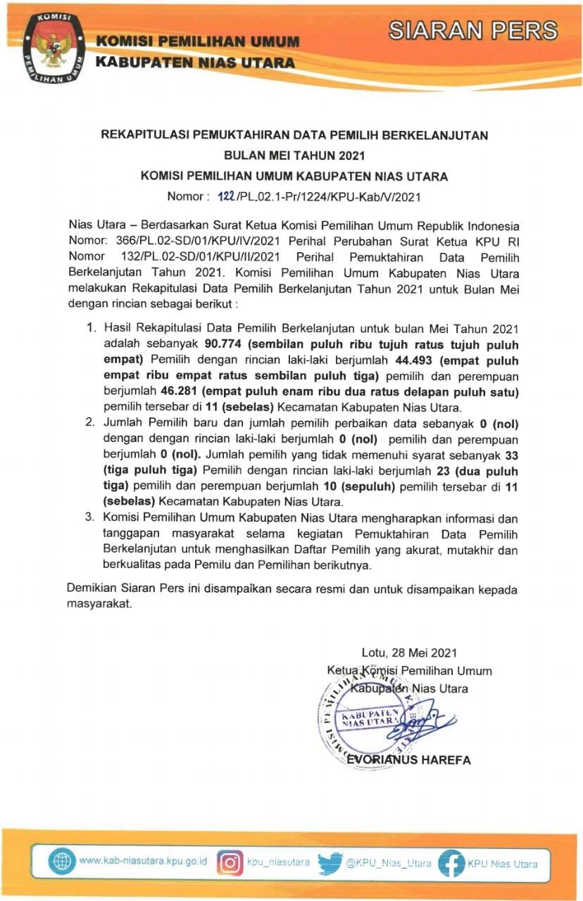 Nias Utara, kab-niasutara.kpu.go.id – Berdasarkan Surat Ketua Komisi Pemilihan Umum Republik Indonesia Nomor 366/PL.02-SD/01/KPU/III/2021 tanggal 21 April 2021 perihal Perubahan Surat Ketua KPU RI Nomor 132/PL.02-SD/01/KPU/II/2021, bersama ini disampaikan Rekapitulasi Data Pemilih Berkelanjutan untuk Bulan Mei Tahun 2021. Selengkapnya... KLIK DISINI