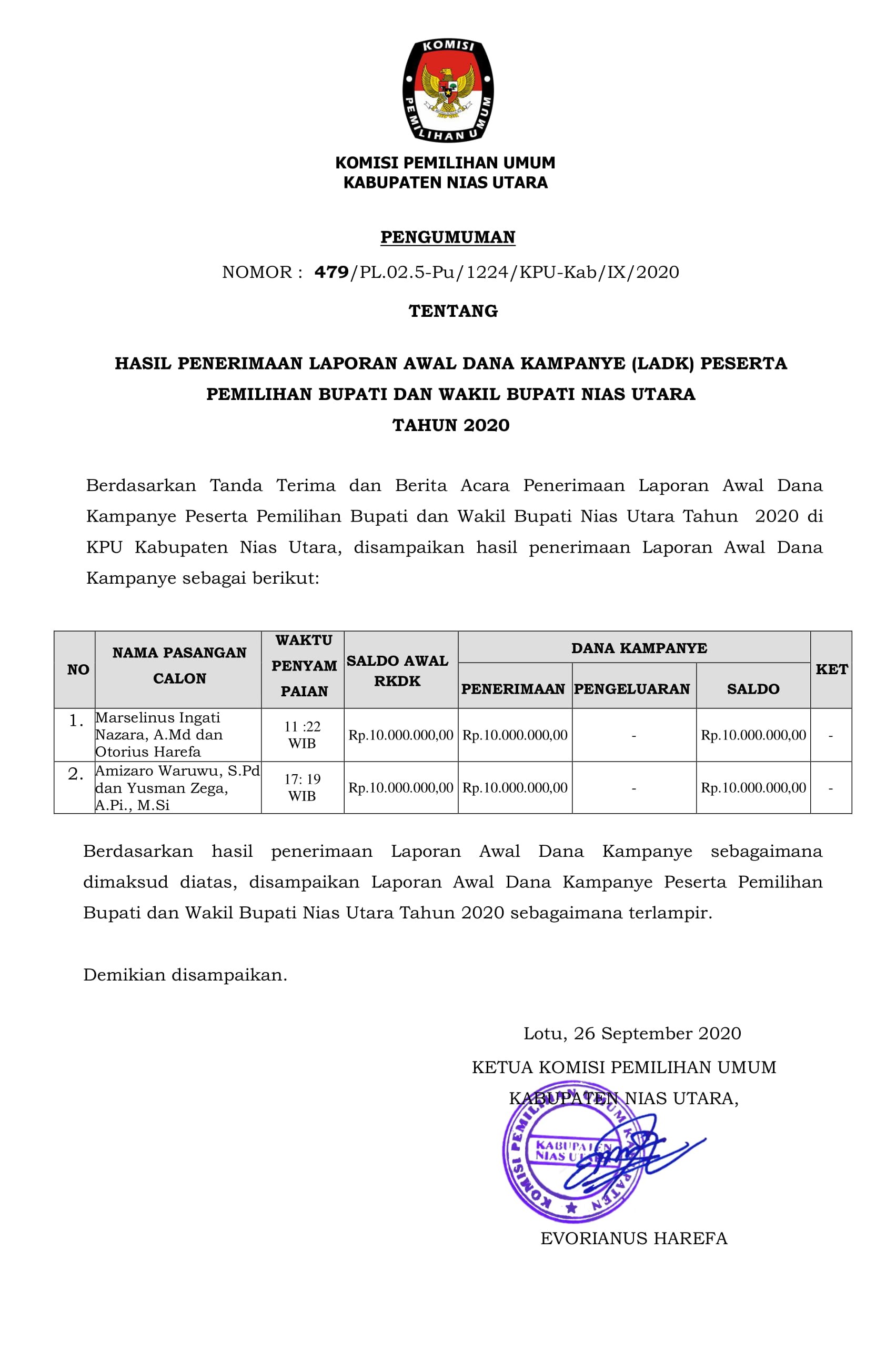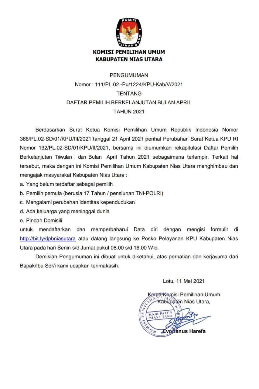 Pengumuman Komisi Pemilihan Umum Kabupaten Nias Utara Nomor : 111/PL.02.-Pu/1224/KPU-Kab/V/2021 tentang Daftar Pemilih Berkelanjutan Bulan April Tahun 2021, dan KPU Kabupaten Nias Utara menghimbau dan mengajak masyarakat Kabupaten Nias Utara : yang belum terdaftar sebagai pemilih, Pemilih pemula (berusia 17 Tahun / pensiunan TNI-POLRI), mengalami perubahan identitas kependudukan, ada keluarga yang meninggal dunia, dan Pindah Domisili untuk mendaftarkan dan memperbaharui Data diri dengan mengisi formulir di http://bit.ly/dpbniasutara atau datang langsung ke Posko Pelayanan KPU Kabupaten Nias Utara pada hari Senin s/d Jumat pukul 08.00 s/d 16.00 Wib. Selengkapnya... Pengumuman KPU Nias Utara