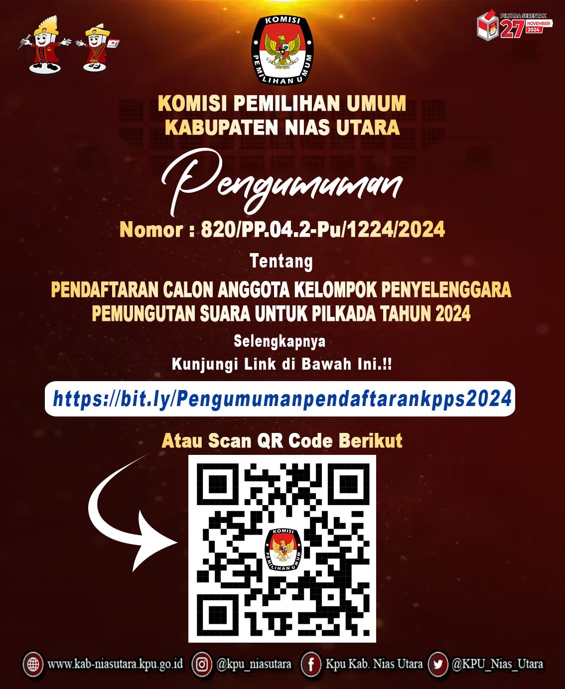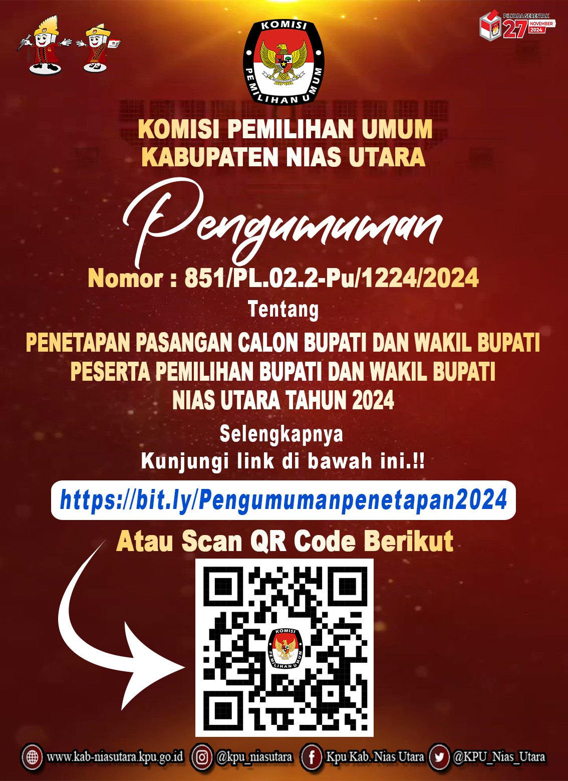 PENGUMUMAN PENETAPAN PASANGAN CALON BUPATI DAN WAKIL BUPATI PESERTA PEMILIHAN BUPATI DAN WAKIL BUPATI NIAS UTARA TAHUN 2024 Minggu, 22 September 2024 00:00 1004 Selengkap kunjungi link dibawah ini. Klik disini Baca Selengkapnya