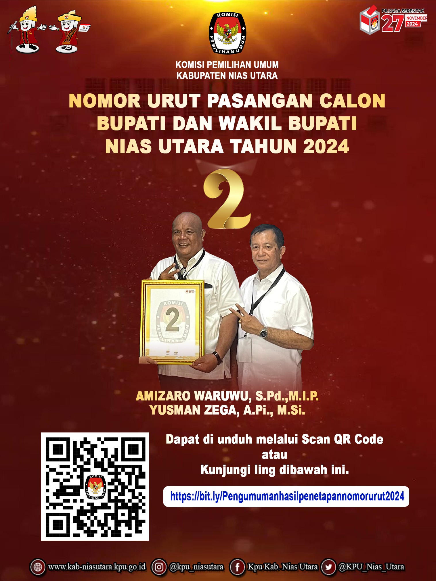 PENGUMUMAN HASIL PENETAPAN NOMOR URUT PASANGAN CALON PESERTA PEMILIHAN BUPATI DAN WAKIL BUPATI NIAS UTARA TAHUN 2024 Senin, 23 September 2024 00:00 965 Selengkapnya klik link dibawah ini. Klik disini Baca Selengkapnya